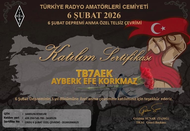 My name is Ayberk Efe Korkmaz, callsign TB7AEK. I'm an Electrical and Electronics Engineering student and a licensed amateur radio operator. I enjoy combining my technical interests with amateur radio and sharing what I learn along the way. Amateur Radio in Türkiye In Türkiye, amateur radio is supported and organized through associations like TRAC (Türkiye Radyo Amatörleri Cemiyeti). Anyone interested can take a licensing exam and legally operate on amateur bands with a personal callsign.