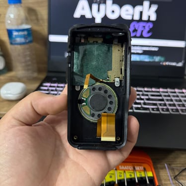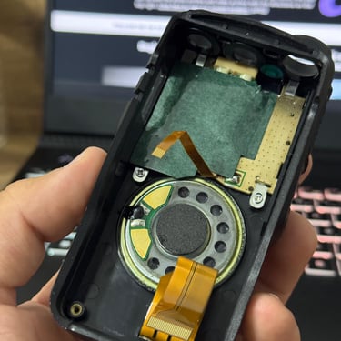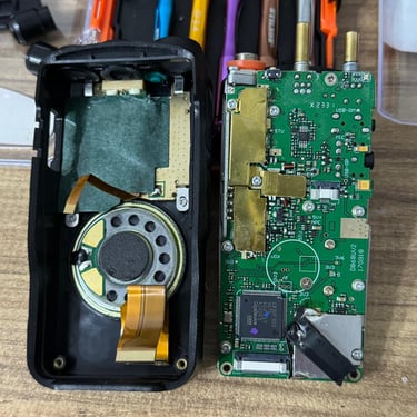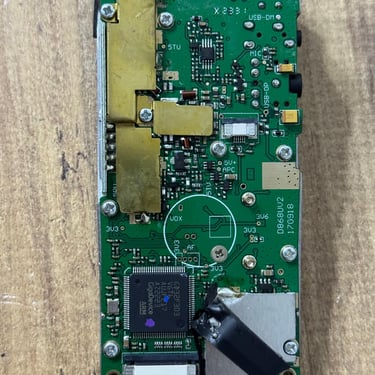 Following the first IF stage and associated SAW filtering, the signal undergoes a second frequency conversion to baseband, producing quadrature I/Q signals. These signals are digitized by an ADC and processed by the internal DSP, which performs demodulation, decoding, and audio processing. The recovered audio is then converted back to analog form and amplified to drive the internal speaker. The transmit chain mirrors this architecture in reverse, with the addition of RF power amplification and harmonic suppression stages.