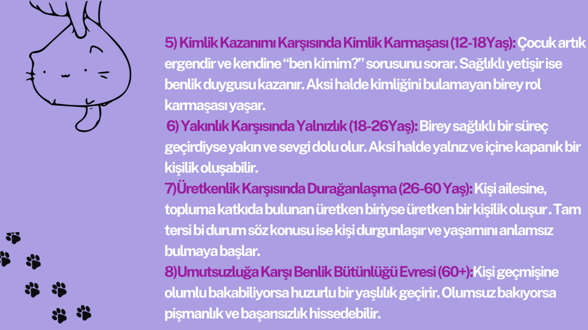 Erik Erikson, psikososyal gelişimi sekiz evrede ele almış ve her evrede çözülmesi gereken bir "kriz" olduğunu savunmuştur.
