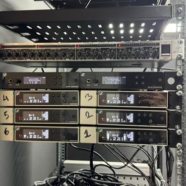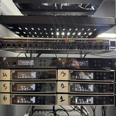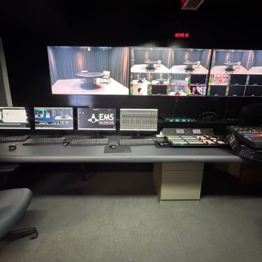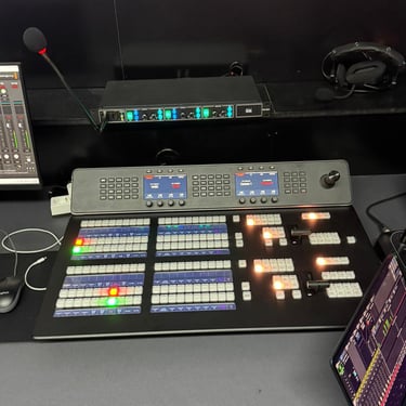 Audio monitoring is achieved through near-field reference monitors and closed-back studio headphones, ensuring accurate signal evaluation during live production.