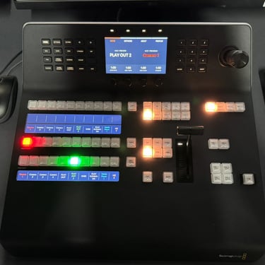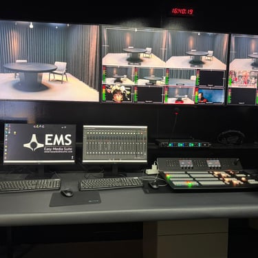 All camera feeds and auxiliary video sources are then directed into a live production switcher, typically a hardware-based system such as the Blackmagic ATEM Television Studio. The switcher performs real-time video mixing, including cut and transition operations, downstream and upstream keying (DSK/USK), chroma/luma keying, and multi-layer compositing. It also generates a multiview output for monitoring all sources simultaneously. The program (PGM) and preview (PVW) outputs are distributed via SDI for downstream processing and monitoring.