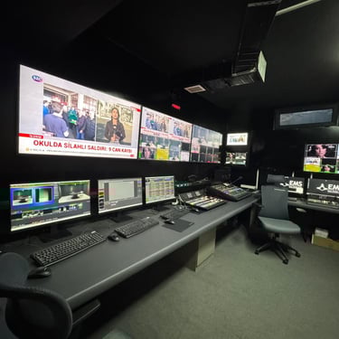 The monitoring system consists of multiple broadcast displays configured for multiview, program, and preview outputs. Multiview displays aggregate all input sources, audio meters, and status indicators into a single screen, typically driven by the switcher’s multiview output. Dedicated program monitors display the final output signal, ensuring quality control before transmission.