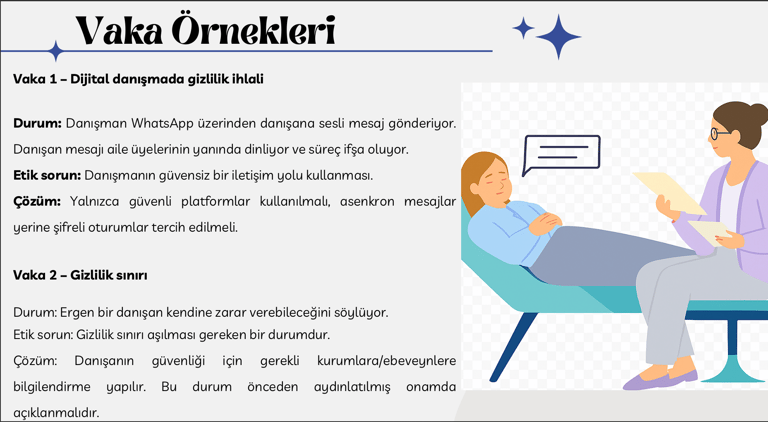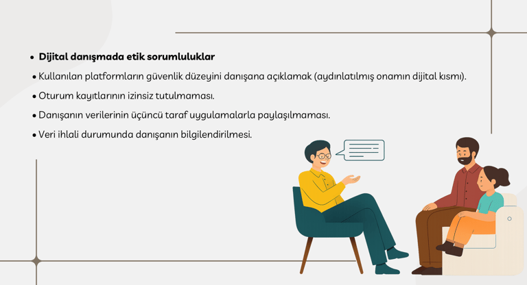 Dijital danışmada etik sorumluluklar: kullanılan platformların güvenlik düzeyinin açıklanması, oturumların izinsiz kaydedilmemesi, danışan verilerinin üçüncü taraflarla paylaşılmaması, veri ihlali hâlinde danışanın bilgilendirilmesi.