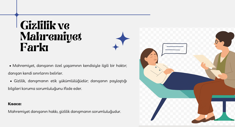 Mahremiyet, danışana ait özel yaşam alanıdır; danışan sınırları belirler. Gizlilik ise danışmanın danışana ait bilgileri koruma yükümlülüğüdür. Mahremiyet danışanın hakkı, gizlilik danışmanın sorumluluğudur.