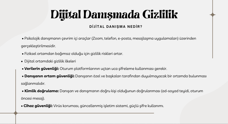 Dijital danışma, çevrim içi araçlarla yapılan psikolojik danışmadır ve gizlilik riskleri yüksektir. Dijital gizlilik ilkeleri: verilerin şifrelenmesi, danışanın özel ortamda bulunması, kimlik doğrulama yapılması, cihaz güvenliği sağlanması.