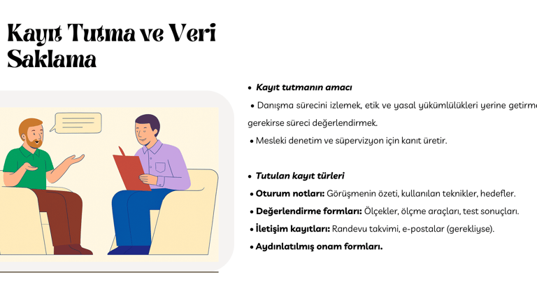 Kayıt tutmanın amacı danışma sürecini izlemek, etik ve yasal sorumlulukları yerine getirmek, gerektiğinde denetim sağlamaktır. Kayıt türleri: oturum notları, değerlendirme formları, iletişim kayıtları, aydınlatılmış onam formları.