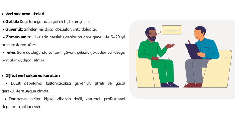 Veri saklama ilkeleri: gizlilik, güvenlik, saklama süresi (5–20 yıl), süresi dolan kayıtların güvenle imhası. Dijital veri saklama: güvenilir ve şifreli bulut depolama, verilerin profesyonel cihazlarda saklanması.