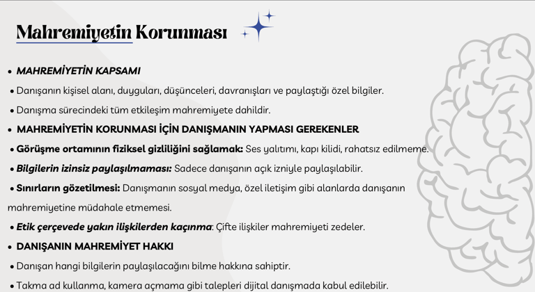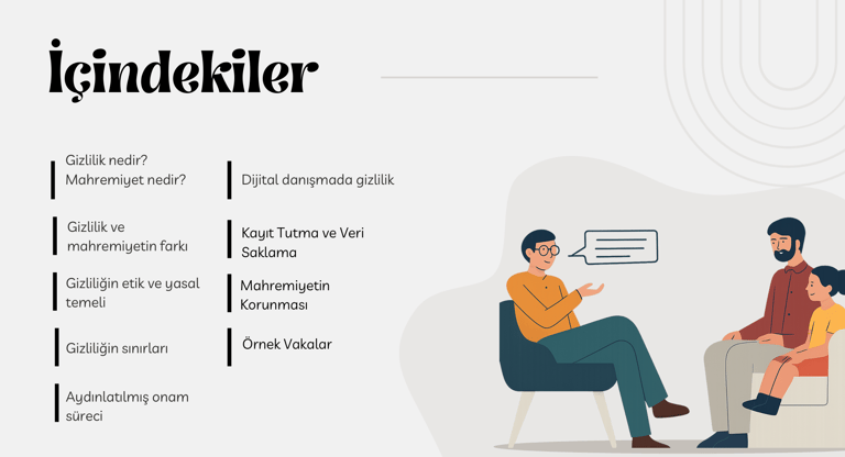 Gizlilik nedir? Mahremiyet nedir? Gizliliğin etik ve yasal temeli, gizlilik ve mahremiyetin farkı, örnek vakalar, kayıt tutma ve veri saklama, aydınlatılmış onam süreci, gizliliğin sınırları, mahremiyetin korunması, dijital danışmada gizlilik.