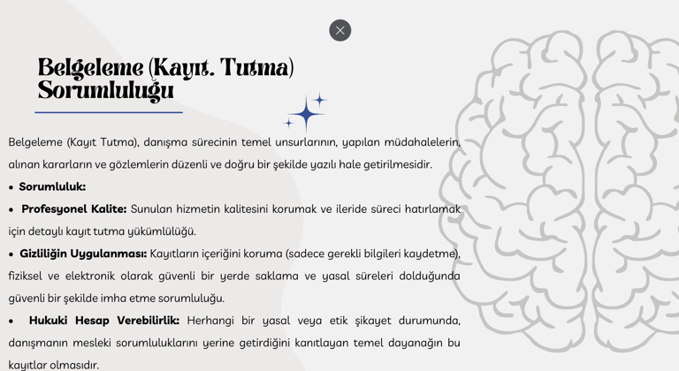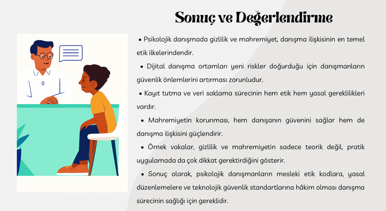 Sonuç: Gizlilik ve mahremiyet psikolojik danışmanın temel etik ilkelerindendir. Dijital danışma ek riskler doğurur. Veri saklama ve kayıt tutma hem etik hem yasaldır. Mahremiyet danışanın güvenini artırır. Etik kodlara ve yasal düzenlemelere hâkim olmak zorunludur.