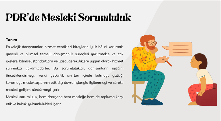 Psikolojik danışmanlar danışanın iyiliğini korumak, bilimsel temelli ve etik danışma hizmeti sunmakla yükümlüdürler. Yetkinlik sınırlarında çalışmak, gizliliği korumak, etik dışı davranışlara karşı durmak ve sürekli gelişim mesleki sorumluluğun parçalarıdır.