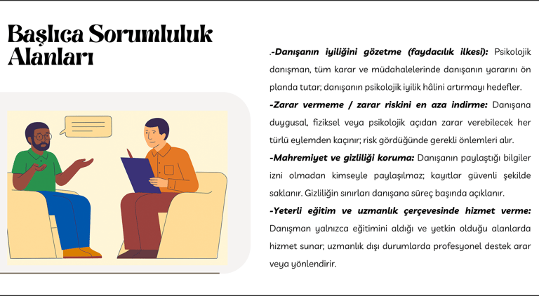 Başlıca sorumluluklar: danışanın iyiliğini gözetmek, zarar vermemek, gizliliği korumak, yetkin olduğu alanlarda hizmet vermek.