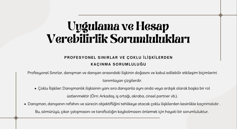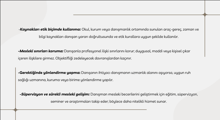 Profesyonel sınırlar ve çoklu ilişkiler: danışanla aynı anda başka bir rol üstlenmek etik değildir; tarafsızlığı ve güvenliği bozar. Danışman çıkar çatışmalarından kaçınmalıdır.