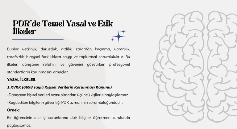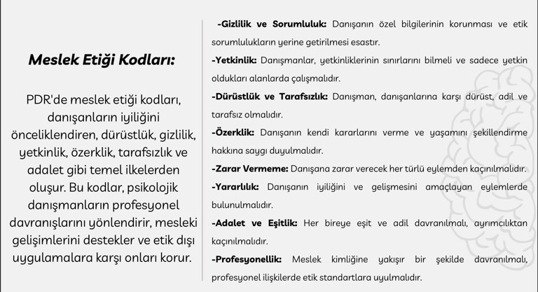 PDR’de temel etik ilkeler: yetkinlik, dürüstlük, gizlilik, zarar vermeme, yararlılık, tarafsızlık, bireysel farklılıklara saygı, toplumsal sorumluluk.
