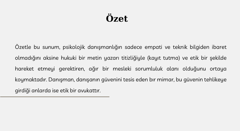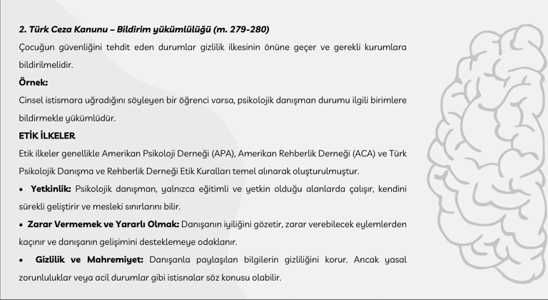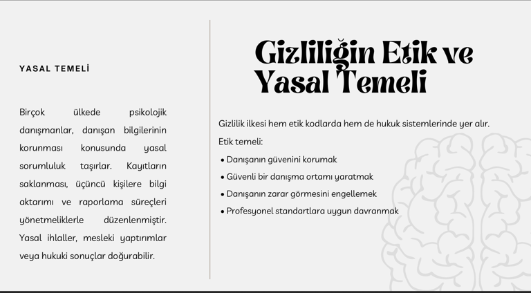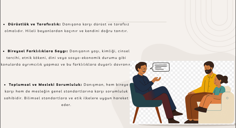 Psikolojik danışma empati ve teknik bilgi kadar etik ve hukuki sorumluluk gerektirir. Danışman, danışanın güvenini sağlayan bir mimar; tehlike anlarında etik bir savunucudur.