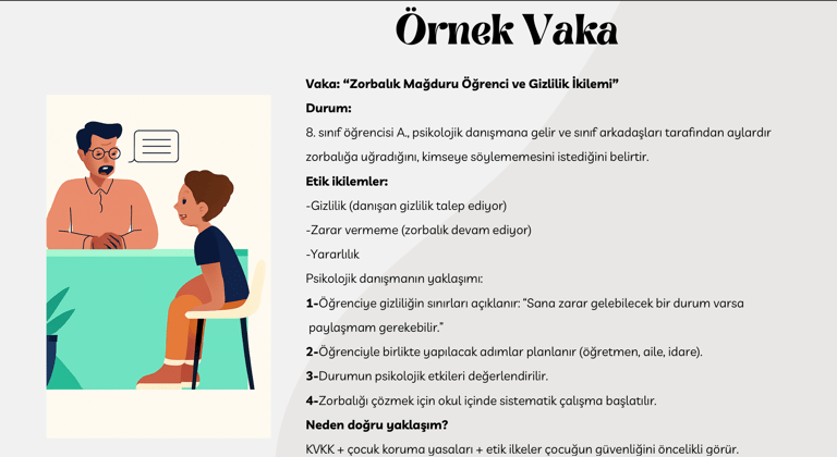 Örnek vaka: Zorbalık mağduru öğrenci—gizlilik talebi ve zarar görme riski çatışır. Danışman gizlilik sınırlarını açıklar, adımları danışanla planlar, psikolojik etkileri değerlendirir, okulda çözüm süreci başlatır.