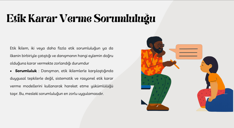 Etik karar verme sorumluluğu: danışman etik ikilemlerde sistematik modeller kullanarak karar verir, duygusal tepkilerle hareket etmez.