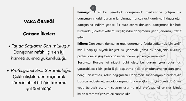 Vaka örneği: Maddi durumu kötü danışanın, danışmana kurs teklifi sunması. Çoklu ilişki riski oluşur. Danışman teklifi reddetmeli, profesyonel sınırlar içinde alternatif çözümler sunmalıdır.