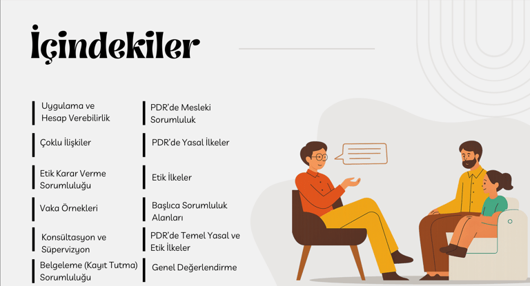 Uygulama ve hesap verebilirlik, etik karar verme sorumluluğu, çoklu ilişkiler, etik ilkeler, PDR’de yasal ilkeler, vaka örnekleri, PDR’de temel yasal ve etik ilkeler, başlıca sorumluluk alanları, konsültasyon ve süpervizyon, belgeleme sorumluluğu, PDR’de mesleki sorumluluk, genel değerlendirme.