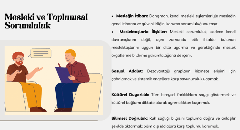 Mesleki ve toplumsal sorumluluk: mesleğin itibarını korumak, etik ihlalde bulunan meslektaşları uyarmak, sosyal adalet, kültürel duyarlılık, bilimsel doğruluk.
