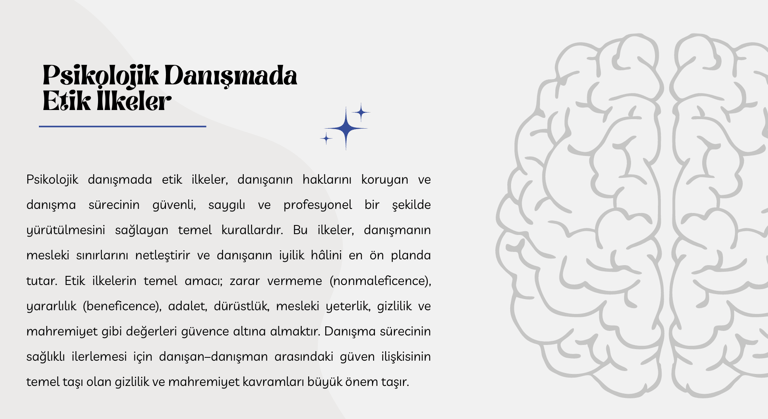 Psikolojik danışmada etik ilkeler, danışanın haklarını koruyan ve danışma sürecinin güvenli, saygılı, profesyonel yürütülmesini sağlayan kurallardır. Bu ilkeler danışmanın mesleki sınırlarını belirler ve danışanın iyilik hâlini gözetir. Zarar vermeme, yararlılık, adalet, dürüstlük, mesleki yeterlik, gizlilik ve mahremiyet temel değerlerdir. Danışan–danışman güven ilişkisinin temelini gizlilik ve mahremiyet oluşturur.