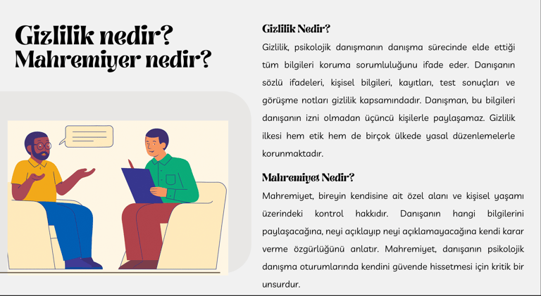 Gizlilik, psikolojik danışmanın danışma sürecinde elde ettiği tüm bilgileri koruma sorumluluğudur. Danışanın sözlü ifadeleri, kişisel bilgileri, kayıtları, test sonuçları ve görüşme notları gizlilik kapsamındadır ve danışanın izni olmadan paylaşılmaz. Mahremiyet ise bireyin kişisel yaşamı üzerindeki kontrol hakkıdır; danışan hangi bilgiyi paylaşacağına kendisi karar verir. Mahremiyet danışanın hakkı, gizlilik danışmanın sorumluluğudur.