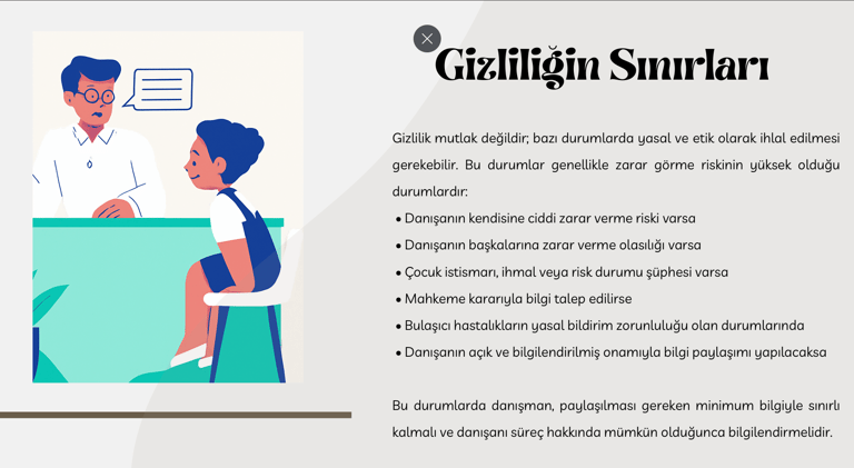 Gizlilik mutlak değildir. Aşağıdaki durumlarda ihlal edilebilir: danışanın kendine zarar verme riski, başkalarına zarar verme olasılığı, çocuk istismarı/ihmali şüphesi, mahkeme kararı, bulaşıcı hastalık bildirimi yükümlülüğü, danışanın açık onamı. Bu hâllerde yalnızca gerekli minimum bilgi paylaşılmalı ve danışan bilgilendirilmelidir.