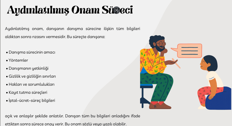 Aydınlatılmış onam, danışanın danışma süreci hakkında tüm bilgileri alarak rıza vermesidir. Süreçte danışma amacı, yöntemler, danışmanın yetkinliği, gizlilik ve sınırları, haklar ve sorumluluklar, kayıt tutma ve ücret–iptal bilgileri açıklanır. Danışan anladığını belirttikten sonra onam verir.