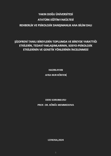 Bu çalışma, Yakın Doğu Üniversitesi Atatürk Eğitim Fakültesi Rehberlik ve Psikolojik Danışmanlık Ana Bilim Dalı bünyesinde, şizofreni tanısı almış bireylerin durumunu çok boyutlu bir perspektifle ele almak amacıyla hazırlanmıştır.