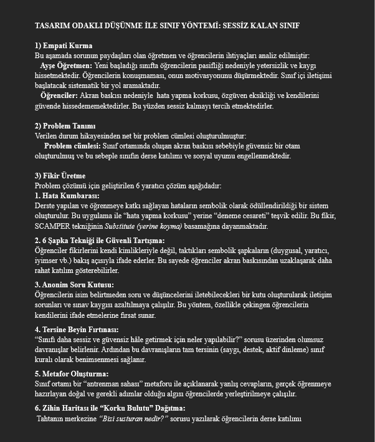 Günümüzde eğitim, sadece bilgi aktarımı değil, karmaşık sorunlara yaratıcı çözümler üretme sürecidir. Tasarım Odaklı Düşünme (Design Thinking); bir problemi çözmek için kullanıcının (öğrencinin) ihtiyaçlarını merkeze alan, yaratıcı ve sistematik bir yaklaşım sunar. Bu yöntem, inovasyon sürecini kolaylaştırırken eğitimde yeni kapılar açar.
